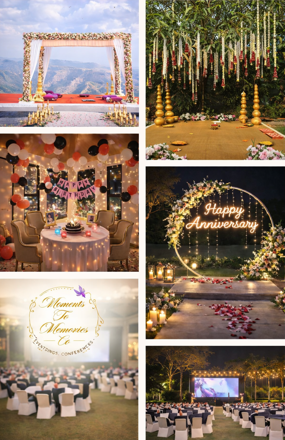 Our gallery showcases luxury weddings, destination celebrations in Mahabaleshwar, corporate events, birthdays, and social gatherings curated by Moments to Memories, Pune. Each event reflects bespoke design, premium styling, and flawless execution crafted to create unforgettable experiences.